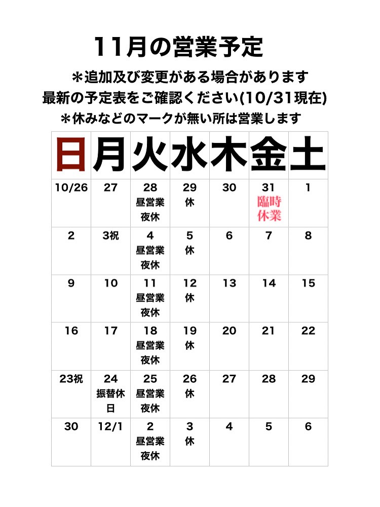 11月の営業予定は以下の通りです。