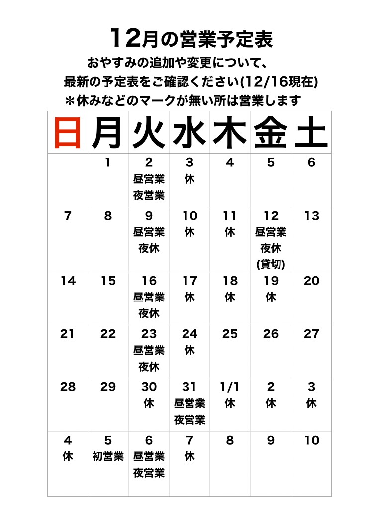 12月・1月前半の営業予定のお知らせ