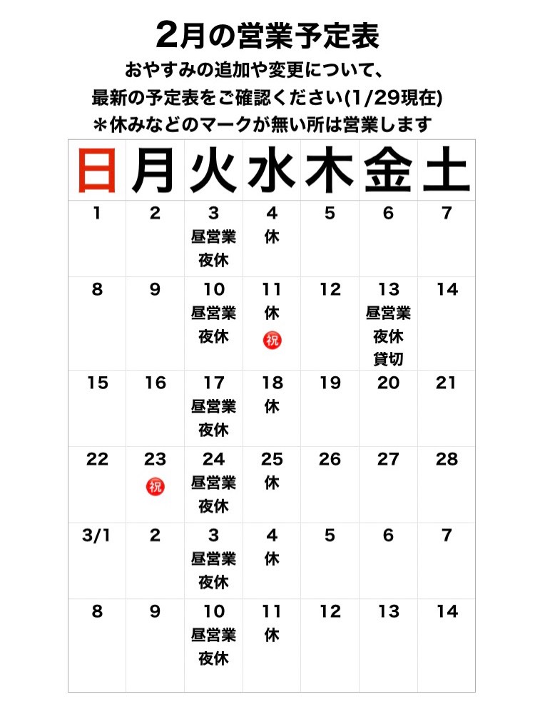 いつも当店をご利用いただきありがとうございます。 2月の営業予定は以下の通りです。
